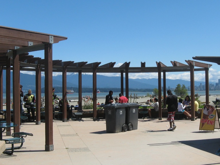 Walk to the circular patio overlooking the beach which is between the Spanish Banks East Cafe and the beginning of the sandy part the beach.